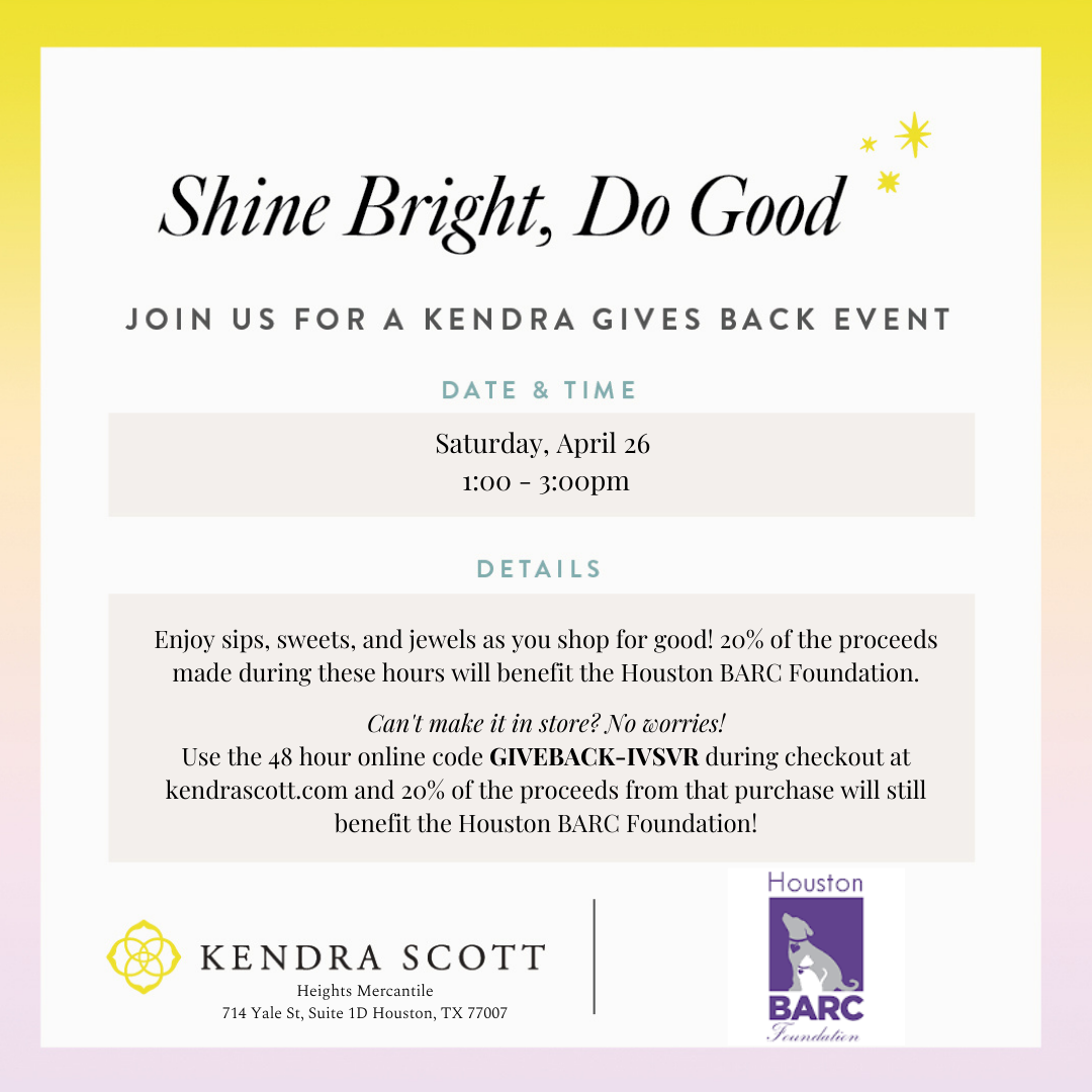 Shop at kendrascott.com anytime from Saturday, April 26th to Sunday, April 27th using the code GIVEBACK-IVSVR and 20% of the proceeds from your purchase will still benefit the Houston BARC Foundation!