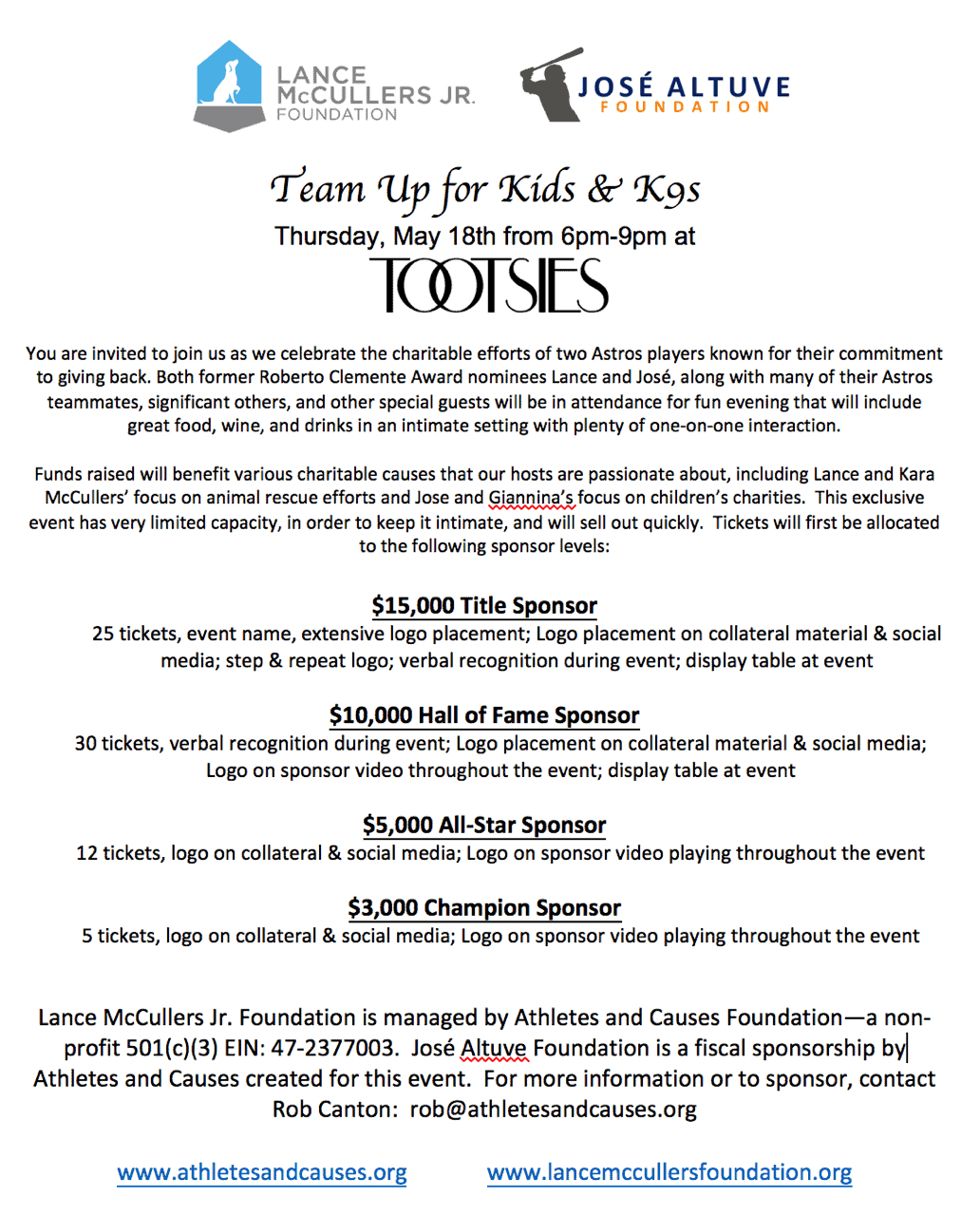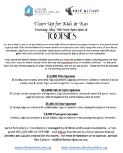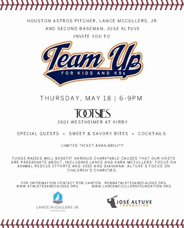 To benefit animals at the BARC Animal Shelter, the Houston Humane Society, and other local rescues in the Houston area through the Lance McCullers Foundation, as well as children with cancer through the Sunshine Kids organization.